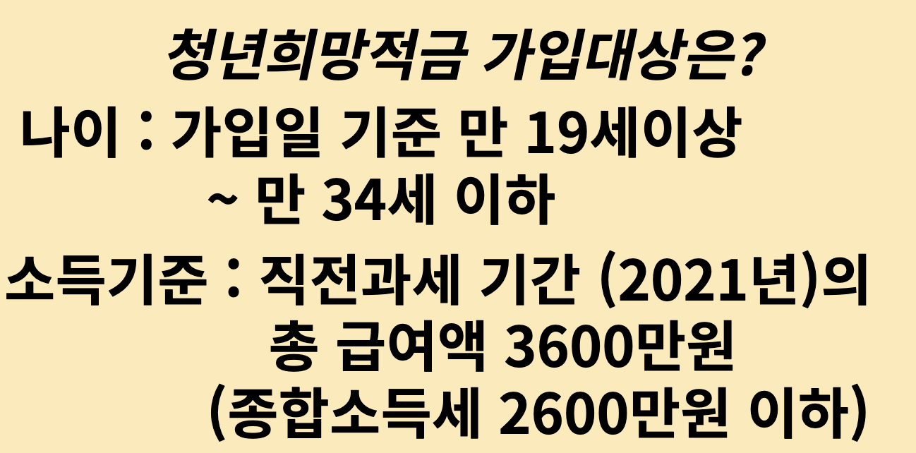 2022 청년희망적금은 나이와 소득기준으로 가입여부가 결정됩니다.